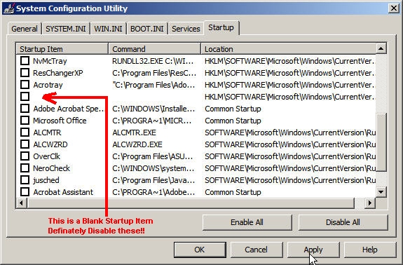 As a good rule of thumb if you don’t recognize the program name leave it on. If you see one that is blank (see below example) DEFINITELY DISABLE IT. These are usually spyware or viruses and you definitely don’t want them starting with your computer. When I see these I always run a Virus Check, then scan for Spyware.